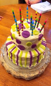At this point we had a new assistant join us, my 13 year old great-nephew, every bakery should have a 13 year old boy to assist. He was delighted when we stuck a wooden barbeque skewer down the center to stabilize the cake. I was delighted that it actually worked and it started to look like a cake instead of a famous tower in Italy! The un-used skewers quickly became swords and there was a lot of silliness, but with the cake warming up we needed to work fast. We rolled fondant and made polka dots, and cut out letters to spell her name. My nephew added a final touch with a multi-color layered polka dot to dot the ‘i’. And the cake was done. I divided the leftover frosting into 2 red solo cups and the kids sat and laughed as they ate it with skewer chop sticks.
