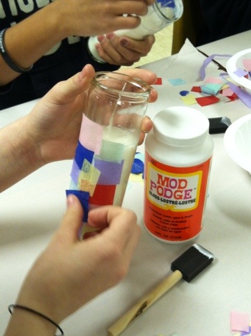 Sometimes going back to basics in crafting is really fun. It is also very rewarding to teach a craft to someone else. Today I led a retreat for 15 middle school aged kids and although I am exhausted I am also feeling very lucky to have spent the day with a great group of kids. One of our activities was to make candles that we will light for their Confirmation service. I went totally old school with Mod Podge and tissue paper on a glass candle holder. I was able to buy the candles in a glass bottle at the dollar store and a multi-color package of tissue paper. A bottle of Mod Podge and some sponge brushes from Michael’s (using my 40% off coupon) were all that we needed to create these beautiful candles. Each of the kids created their own design and even better they bonded with each other over shared crafting. I can’t wait to see how they look all lit up.