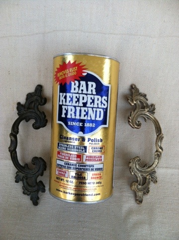 In the meantime I am excited to get started so I removed the tarnished drawer pulls to clean them up. I played around with a couple cleaners and even tried soaking in Coca Cola but I wanted more immediate gratification! Bar Keepers Friend worked great with a little bit of scrubbing with a tooth brush I still had some nice patina but a little brightness too. Because I was thinking about silver accents I thought about spray painting them silver but now I am in love with the way they look.