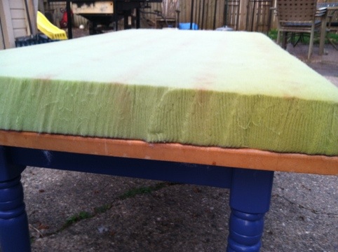 Once I got it home I cleaned and disinfected it thoroughly. I painted the legs and trim blue. I bought a 3 inch thick foam pad and cut it to the same size as the table top – use an electric knife to cut foam it works great. I glued the foam to the the table top with my hot glue gun and then it was ready to upholster.
