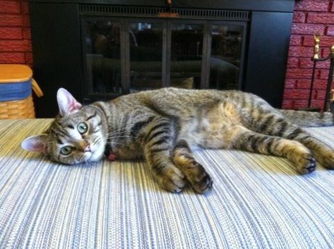 As soon as I finished the bench my son was proud to be the first human to sit on the newly covered bench – first human, because the cat had already staked her claim and so the fighting over the best seat in the house has already begun!