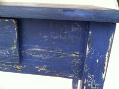 Once I got all the flaking paint off I had to decide on the next step. I still wasn’t sure if this was an extreme waste of time or a piece that I would be bragging about. I didn’t want to invest any money so I pulled out the blue paint that was left over from the coffee table to bench redo. Unfortunately the color just seemed too bright and I was starting to lose interest – so the table went back into the garage again!