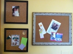 I wanted to hang a cork board in my office but since my office is sort of in the middle of everything I didn’t want it to look too shabby. I had a frame that I liked but I couldn’t find a piece of cork to fit it. I found lots of cheaply framed boards that were a little bigger than I needed so I bought one and broke the frame, yes broke because that was the only way to get the frame off! Once I got the frame off it was easy to cut the cork to fit my frame. I also framed a cork board for each of my kids to keep track of some of their things. It doesn’t look too bad!