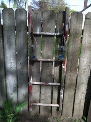 One of the pieces that I found still had the locking brackets attached, they were rusted and looked like they would be great for my hanging jars. I attached the ladder to my fence with a couple screws and some steel strapping. Then I hung a jar from each of the brackets (learn how to make hanging jars here.)