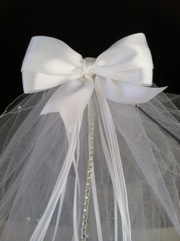 My niece is making her first Communion in a few weeks and I have the honor of making her veil. Making a veil is a fun project, easy and inexpensive. The first veil I made was my wedding veil after being shocked by the price of the veils at the bridal salon my mom convinced me that we could make it ourselves for far less. Of course mom was right and my veil was far nicer than the one at the salon for a quarter of the price. For my daughter’s first Communion veil she couldn’t find what she was looking for at the store so I made her a veil to her specifications. Deciding on the style is probably the most difficult step but my niece had tried several styles and knew she wanted a bow and sparkles.