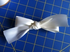 I started with the wide satin ribbon and made a basic bow. I cut about 24 inches in length and rolled it into a double circle and flattened it so that there was two loops and a tail on each side.