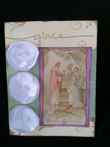 I found a vintage French prayer card online that I was able to copy and print. Then I simply cut it out and glued it to my card. I added some flowers that I made from the satin ribbon that was left from her veil. Quick and easy! I love you Grace!