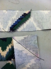 Back to the tie: I followed the directions and watched the video but the first seam had me confused. A bias seam: “lay pieces with angled ends placed together, right sides facing, at a 90-degree angle.” Following these instructions resulted in a zig zag.