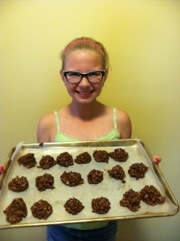 It seems she had decided to DIY and make some no-bake cookies! She had gone on the internet a searched for a recipe and found this one: No Bake Cookies I. She had all the ingredients in the pan and seemed to be doing a great job. As I was looking at the pan I saw some tiny marshmallows in the pan, hmmm? I asked her if the recipe called for cocoa and of course she said yes and then showed me the box of hot cocoa mix with mini marshmallows. I explained the difference between cocoa and cocoa mix and we decided just to add the cocoa because as she said, you can never have too much chocolate.