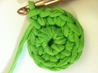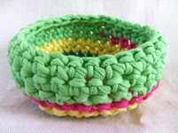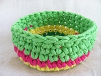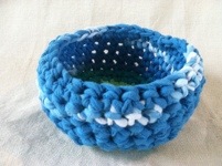 Next round I did 1 single crochet in the first 2 stitches and 2 single crochet in the next stitch. I stuck a little marker at the first stitch of the round so I could keep track of where I was. Next time around1 single crochet in the first 3 stitches then 2 single crotchets in the next, repeat all the way around. The next time around 1 crochet for each stitch. Then I continued 1 single crochet per stitch each round until I had the height I wanted. I pulled the end through and l wove the end in. My bowl curved in a little but if I turned it inside out it curved out. It really just depends on the look you like. I made 2 bowls for my daughter to keep all her pony tail holders and hair clips. These were quick and easy to make (once I figured out the how to) and a great way to use up my t-shirt yarn scraps!